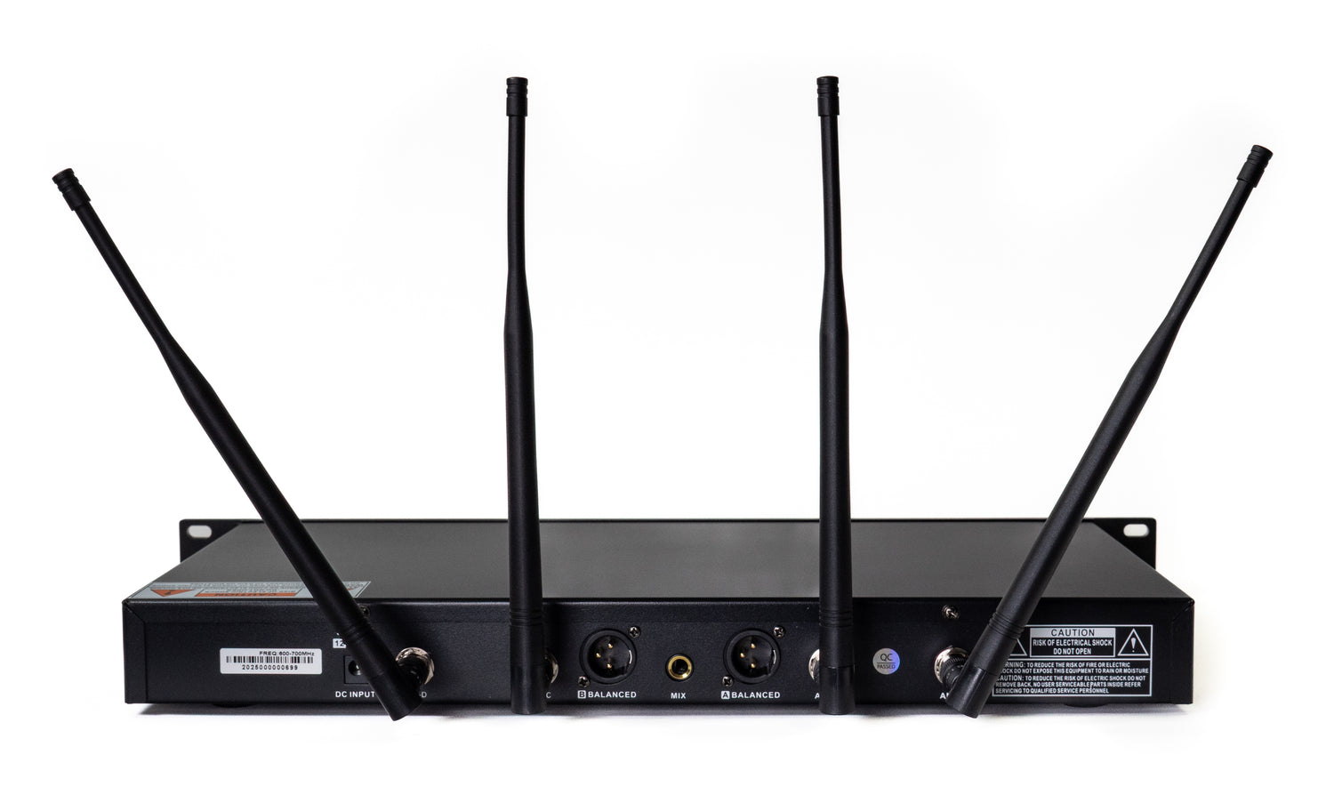 Professionel UHF trådløs mikrofon med 200 valgbare UHF-frekvenser, 4 antenner, SMT-kredsløbsdiversitet, IR-scanning af frekvenser og en maksimal rækkevidde på op til 200 meter – ideel til sceneshows og optræden.