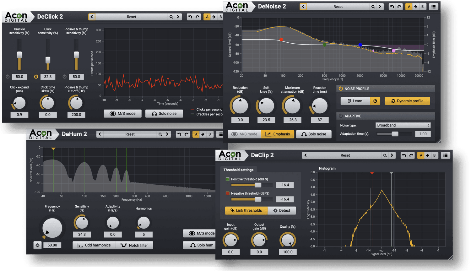 Opdag vores Restoration Suite, en banebrydende samling af fire avancerede audio restoration plugins designet til at give nyt liv til dine optagelser! Uanset om du har med sus, vindstøj, brum, summen, klik eller andre uønskede lyde at gøre, har denne suite dig dækket.