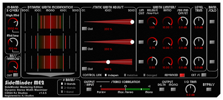 SideMinder ME2 giver den ultimative MONO KOMPATIBLE stereo billede forbedring og kontrol. SideMinder ME2 er en avanceret og funktionsrig version af den originale SideMinder med op til tre uafhængige bånd af stereo bredde kontrol plus Bass Narrow kontrol. Yderligere funktioner inkluderer valgbar input/output korrelation måling, stereo/mono og normal/delta outputs til hurtigt at afprøve SideMinder ME2’s handling. Også inkluderet er en “Advanced” kontrol sektion for dem, der ønsker at finjustere SideMinder ME2’s Width Limiter sektion. SideMinder ME2 kan bruges til at forbedre og kontrollere stereo bredden af blandet program materiale og kan tilføje en “3D” kvalitet, der skal høres! Som i den originale SideMinder, er SideMinder ME2 ikke en kompressor og påvirker ikke dynamikken i dit mix, kun stereo bredden. SideMinder ME2 tilføjer ikke ambiance, men fremhæver i stedet bredden i det originale kilde materiale. SideMinder ME2 har nu en ekstern sidechain input for en meget unik måde at “få et signal til at passe ind i mixet” - WIDTHWISE! På samme måde som en kompressor kan være sidechainet til at dæmpe niveauet af kilde signalet som reaktion på stigninger i sidechain niveau, kan SideMinder ME2 reducere stereo bredden af kilde signalet som reaktion på stigende bredde af sidechain signalet. (Ekstern sidechain kræver et stereo signal, som ikke understøttes i nogle DAWs.)