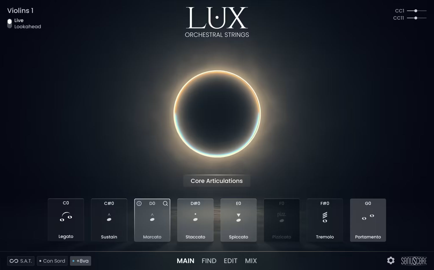 LUX Orchestral Strings lader dig gøre noget, som samplebiblioteker sjældent opnår — forme artikulationer, som om de var levende. Ved at bruge modhjulet kan du sømløst blande mellem to eller flere artikulationer i realtid. Sustains kan smelte ind i tremolos, sul ponticello teksturer kan svulme op til glitrende atmosfærer, og en staccato kan transformere til en kraftfuld sforzando med en enkelt bevægelse.