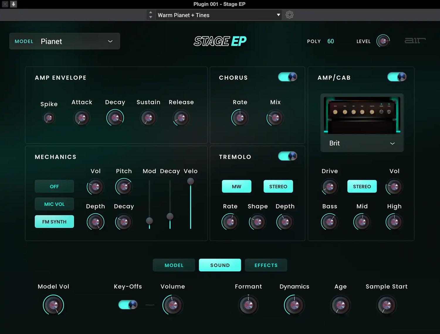 De samme grundtoner som standard Rhodes-modellen, men kørt med ekstra gain for at varme signalet op og forstærke de søde harmoniske overtoner fra instrumentet.