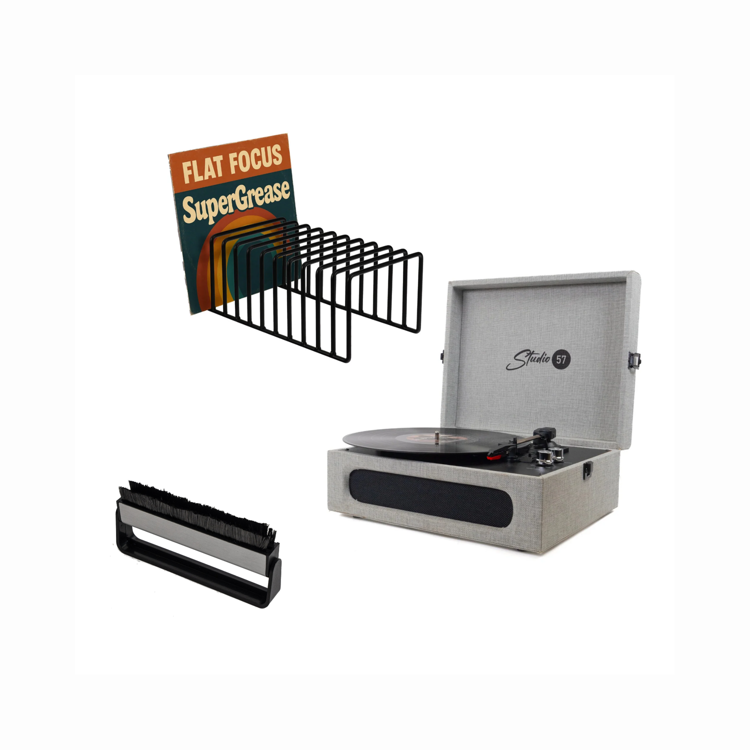Dette bundle består af 1 Studio 57 Groovy Pladespiller (Grå), Studio 57 Vinylholder til 12" Plader & 1 Studio 57 Kulfiber Vinyl Rensebørste.
