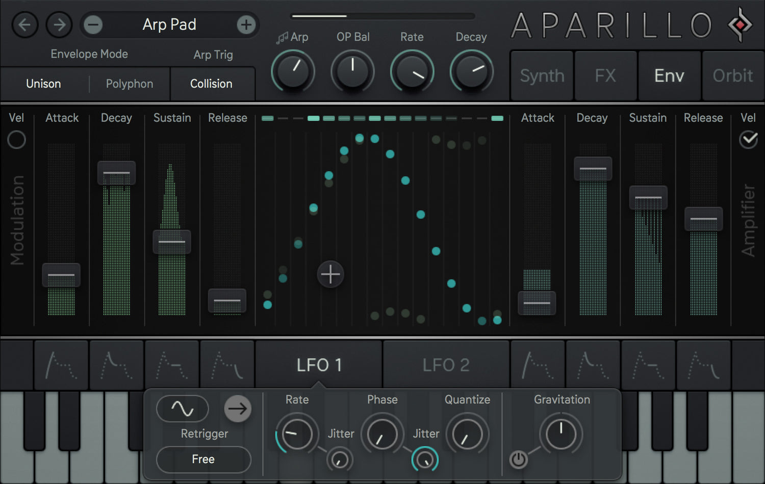 Envelopes viser brugerdefinerbare skråninger, loop-modes og polyfonisk parameter modulation. Den duale Complex LFO bringer nogle specialiteter som FM, Gravitation, Oneshot, S+H/Quantize, og den smukt kaotiske Collision Mode.