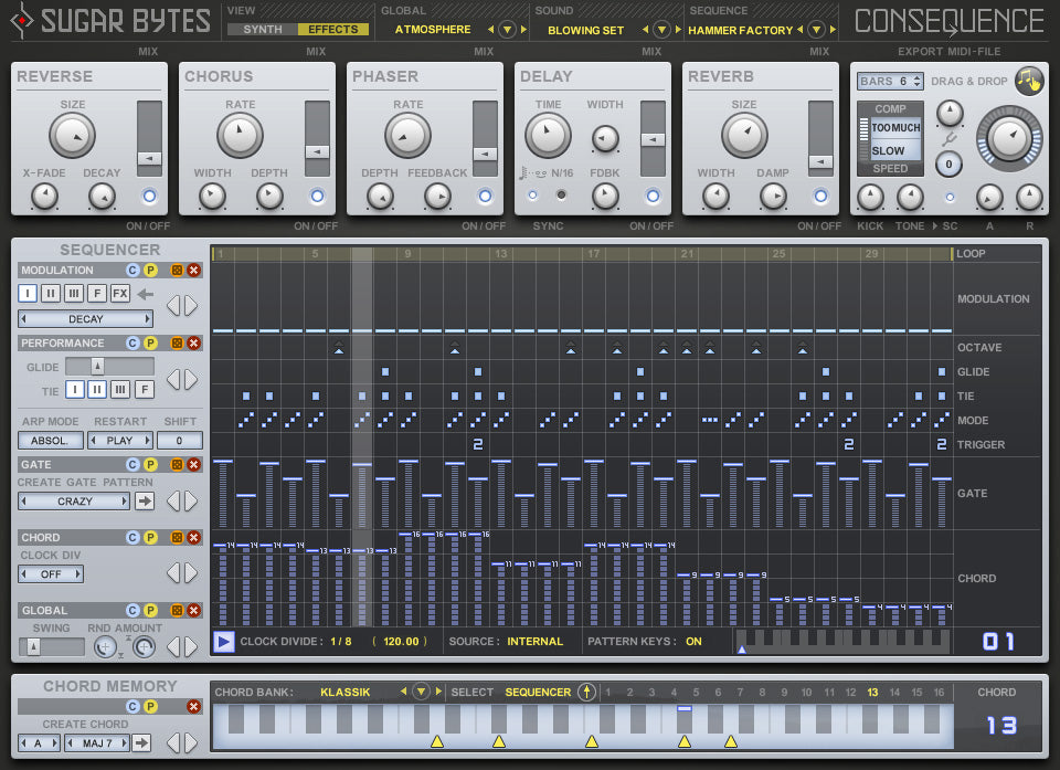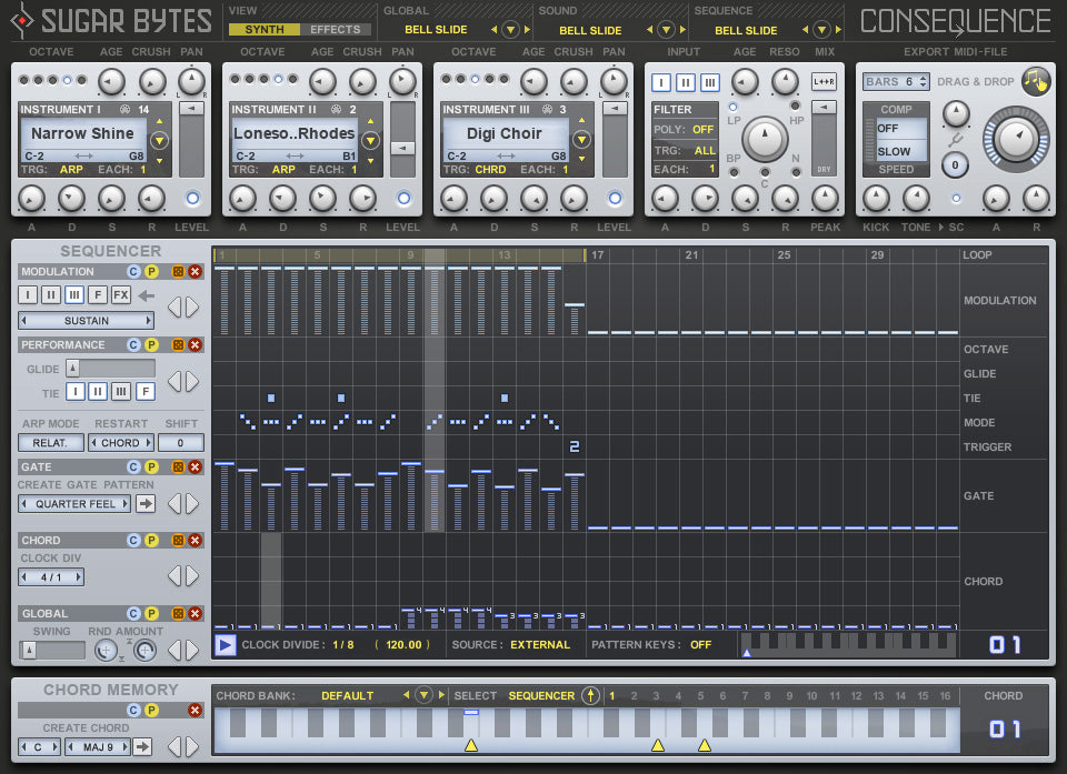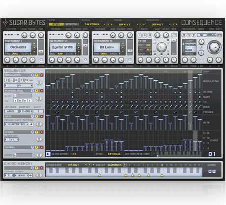 Consequence er en arpeggiator, der skaber en sekvens af noter baseret på de akkorder, du angiver. Op til 3 instrumenter kan indlæses, og et væld af sequencer-muligheder kan bruges til at kontrollere, hvordan plug-in'et "fortolker" dit input.