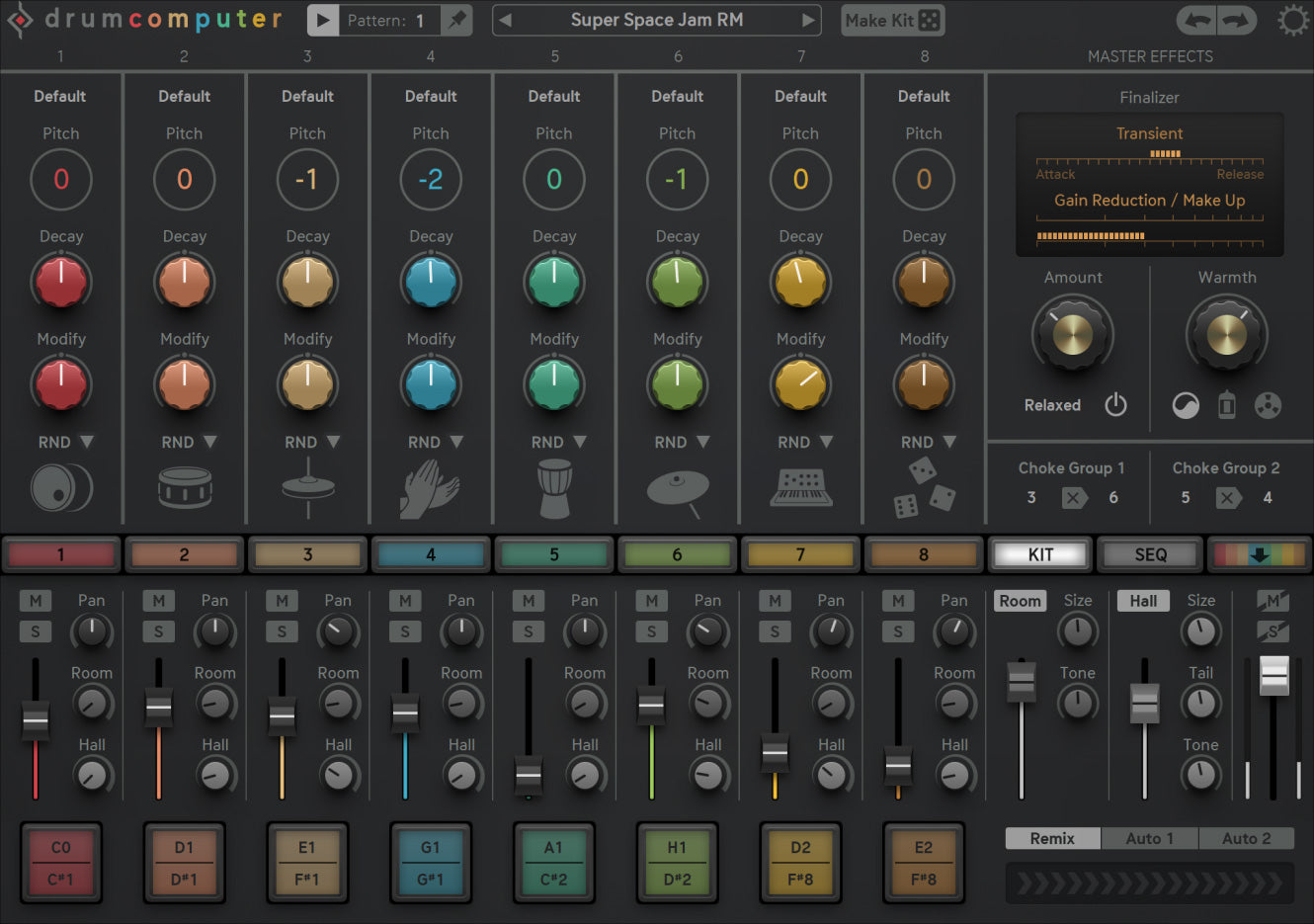 Kit-siden giver de vigtigste funktioner i lydmotoren. Hver af de otte kit-kanaler tilbyder en preset-browser for den individuelle lyd, kontroller for global tonehøjde og decay, en modificeringsknap og en profileret random-funktion. Definer en Mute-gruppe for at få en trigger på én motor til at kvæle lyden på en anden motor og brug Choke Groups til åben/lukket hihat choking, men også til interessante synth-lyde.