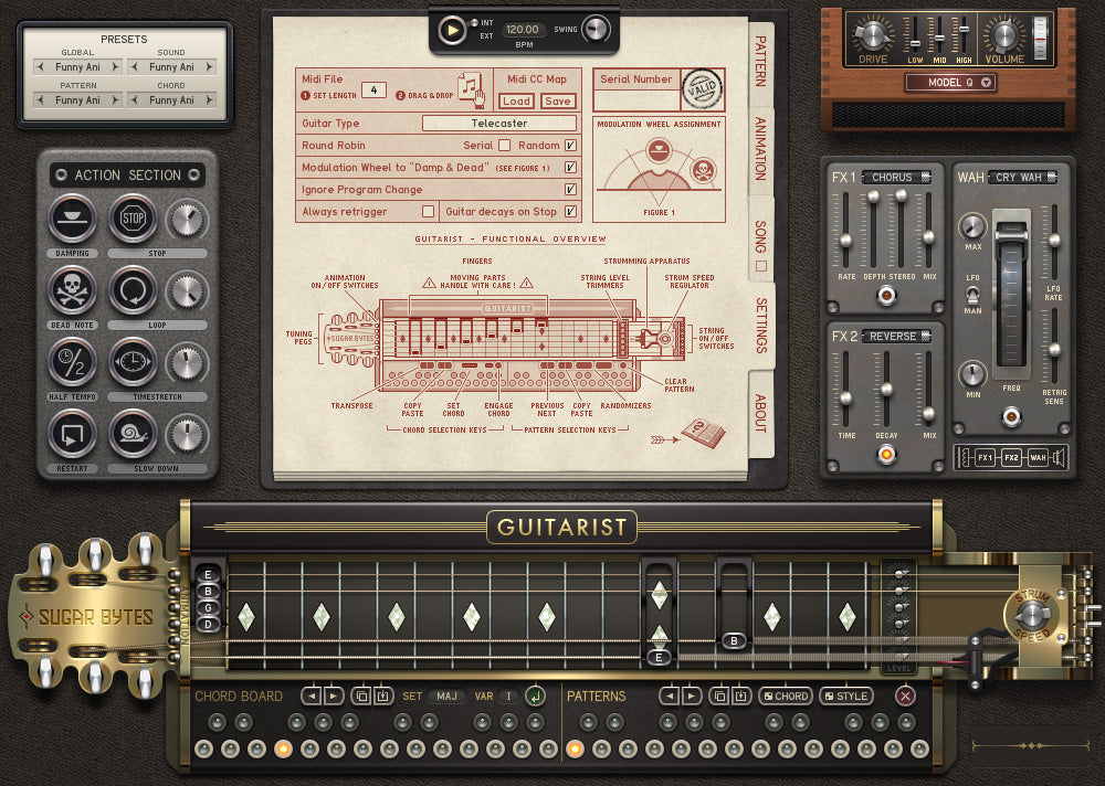 Sound præindstillinger gemmer indstillinger som guitar type og valgte effekter. Pattern præindstillinger gemmer strumming og picking mønstre, mens Chord præindstillinger gemmer akkordændringer.