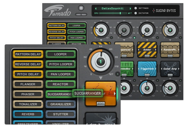 Med øjeblikkelig adgang til otte effekter og øjeblikkelig kontrol over nøgleparametre er Turnado garanteret til at forårsage ødelæggelse på dansegulvet, mens det splitter beats og crunker breaks til vanvittige proportioner.