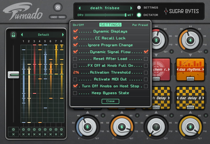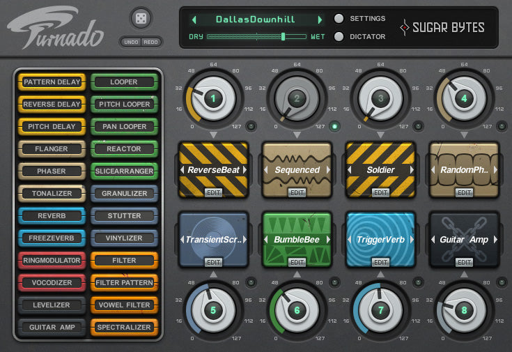 Hold det enkelt! Turnado kommer med 8 knapper, der hver aktiverer en effekt og varierer den med deres drejeknap. Det inviterer til leg og eksperimentering med en eller flere effekter. Tilpas 24 effekter i ekspertmode. Hvis du ønsker det endnu mere kompakt: i Diktator Mode kan du styre alle 8 effekter samtidigt med en enkelt fader.