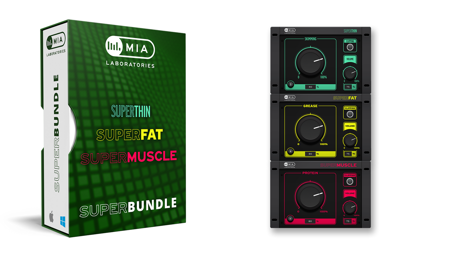 SUPER FAT, THIN and MUSCLE are One-Knob style plug-ins that result from a combination of Mia Lab's Musiqual Red, Musiqual Blue, Musiqual Green plug-ins and a final touch of Pi&Phi magic.