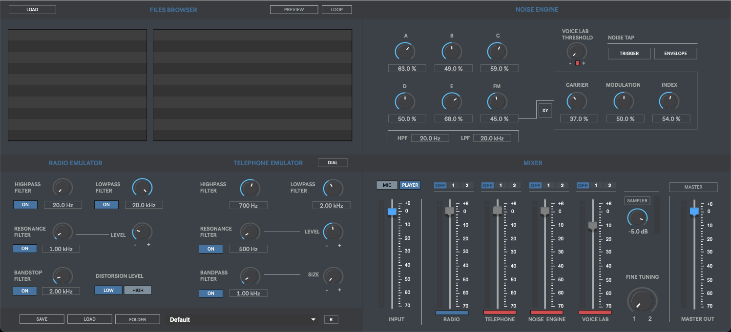 - Noise Engine: Design dit eget radio baggrundsstøj og interferenslyde. Op til 6 forskellige støjsignaler. Kontroller FM Gen parametre via XY Pad. HPF & LPF.