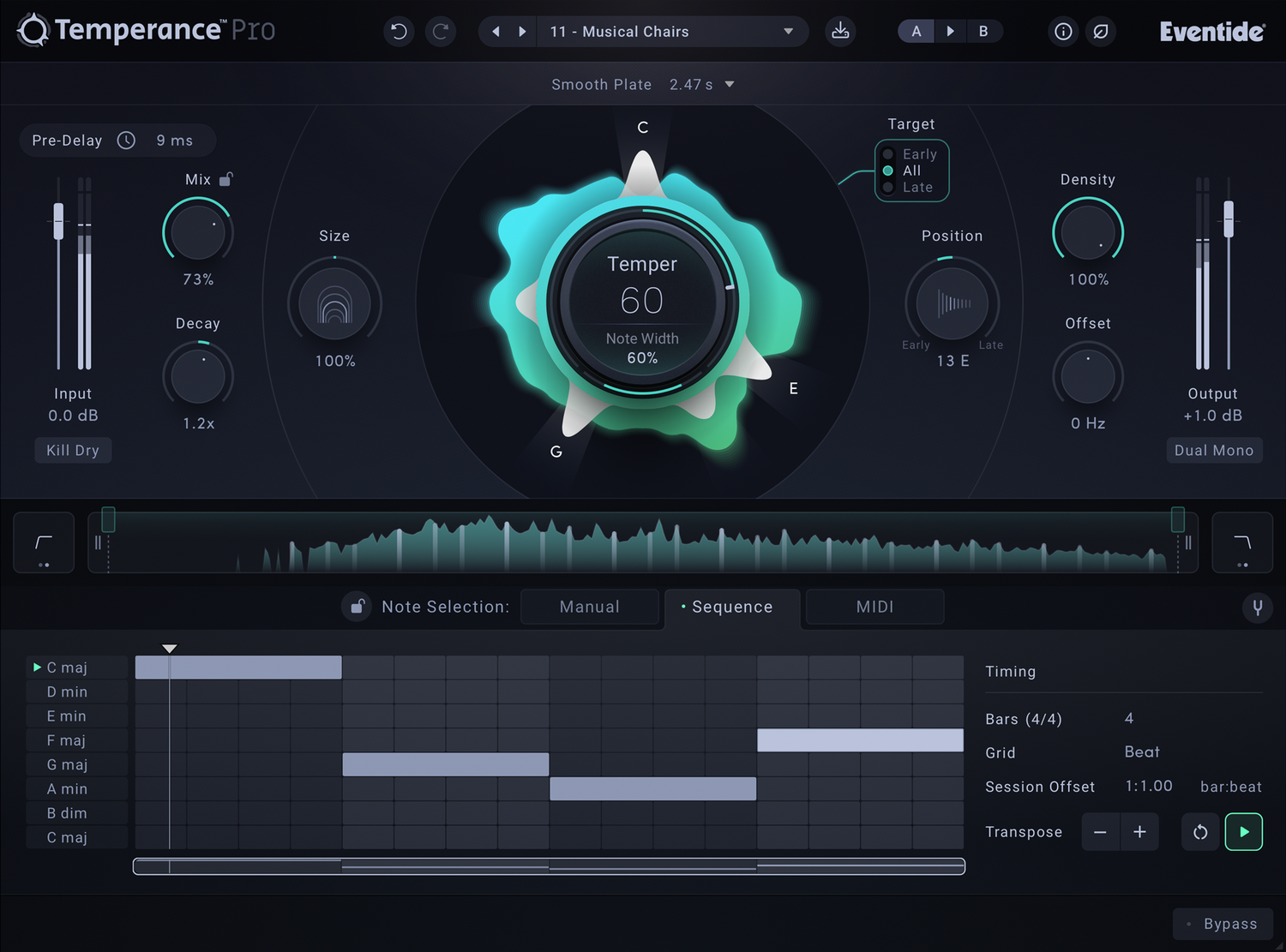 The Mix, Decay, og Size kontroller giver velkendte værktøjer til finjustering af rummet. Temperance Pro udvider disse for første gang med modale funktioner til at forme atmosfæren på unikke måder—selv med Temper knappen sat til middag.