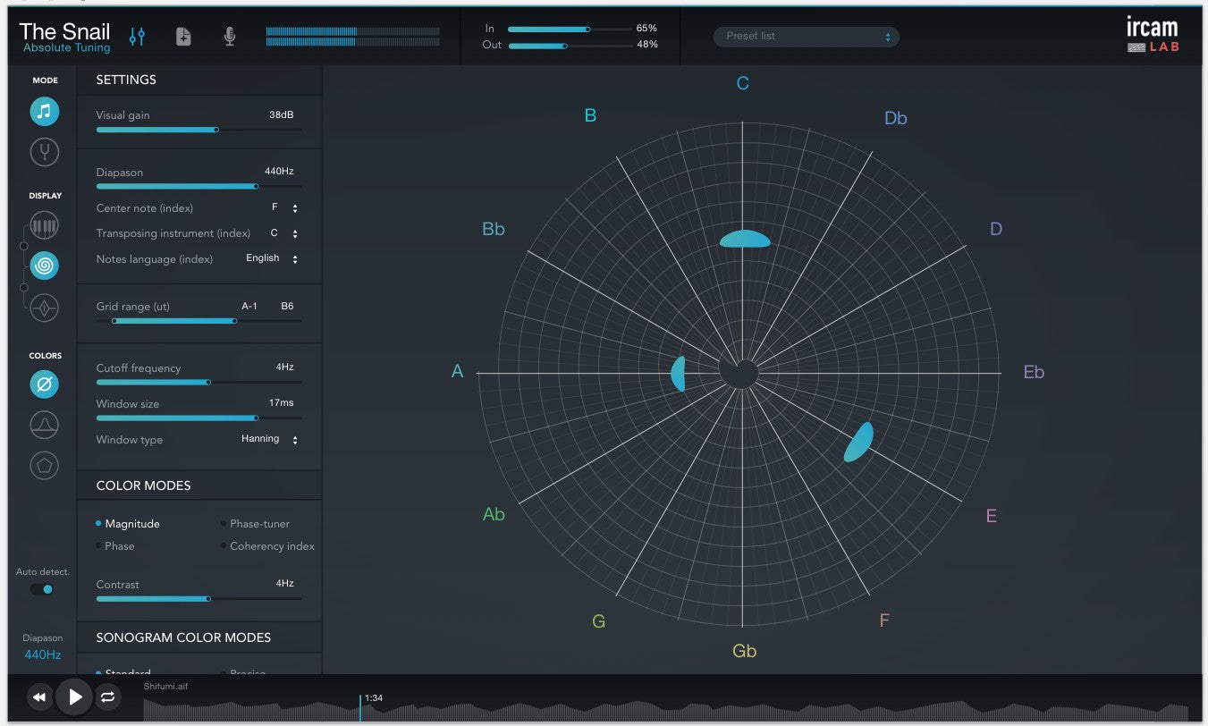 Snail er en meget højpræcisions frekvensdomæneanalysator, der leverer en intuitiv repræsentation af lyde baseret på skalaer og toner, der er justeret i spektrelt aktive zoner.
