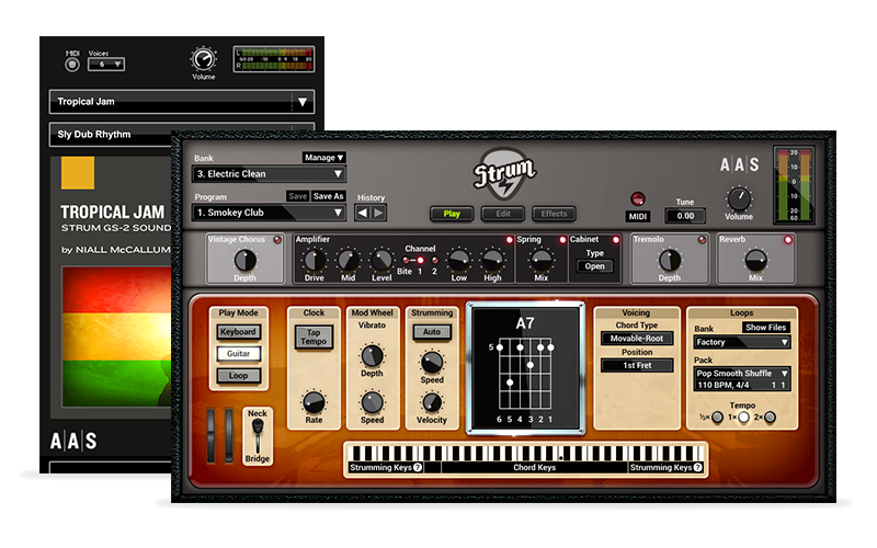Applied Acoustics Systems udgiver Tropical Jam lydpakken til Strum GS-2 og AAS Player plug-ins i samarbejde med den faste lyddesigner Niall McCallum.