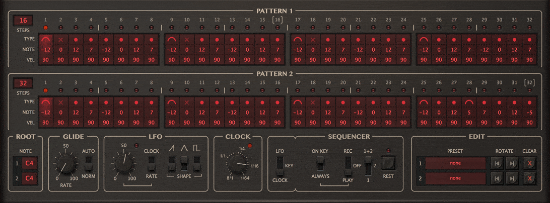Sequenceren i det originale hardware kan have været et geni-stroke. Repro-1's version lader dig step-record to mønstre af op til 32 noter hver, som også gemmes med preset'et og understøtter kopiering/indsætning af mønstrets presets mellem forskellige instanser af plug-in'en.