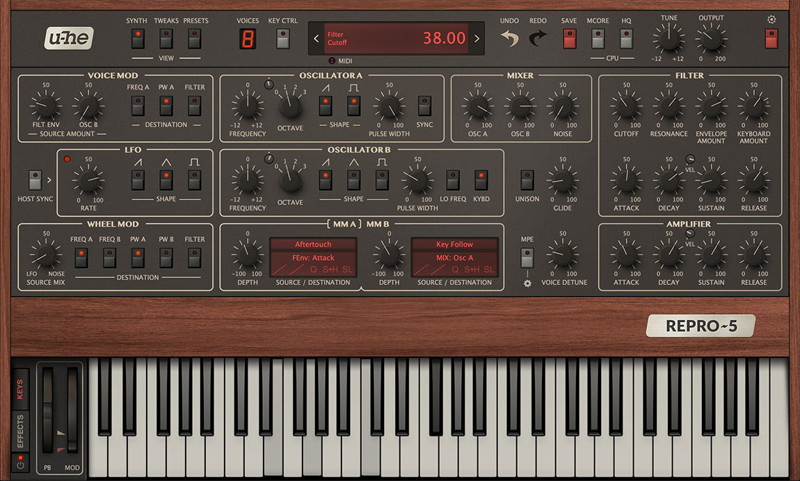 Repro-5 deler meget af det lydmæssige DNA med Repro-1, men tilføjer nye smagsnuancer og karakteristika. Først: det er polyfonisk! Spil rige pads, form dem ved hjælp af det resonante lowpass filter, drive den polyfone distortion enhed så hårdt du vil, og poler til sidst din lyd med fem indbyggede effekter. Hold det frodigt, eller gå efter tykke detunede unison leads. Repro-5 tilføjer nye dimensioner til den velkendte klassiske lyd, mens den holder analog autenticitet i front og center.