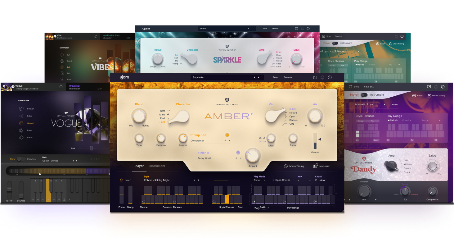 Tilføj studio pop og soul keys fra Virtual Pianist VOGUE og VIBE, varme akustiske og funklende elektriske toner fra Virtual Guitarist AMBER 2 og SPARKLE 2, samt akustiske eller elektriske baslinjer med Virtual Bassist MELLOW og DANDY.