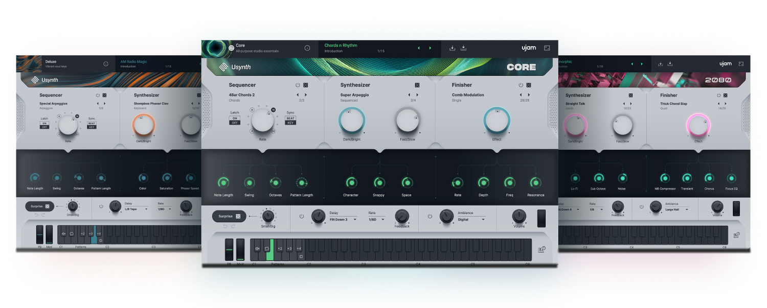 Vigtige studio lyde med Usynth CORE, Usynth DELUXE for frodige soulfulde teksturer og Usynth 2080 for futuristiske lydlandskaber.