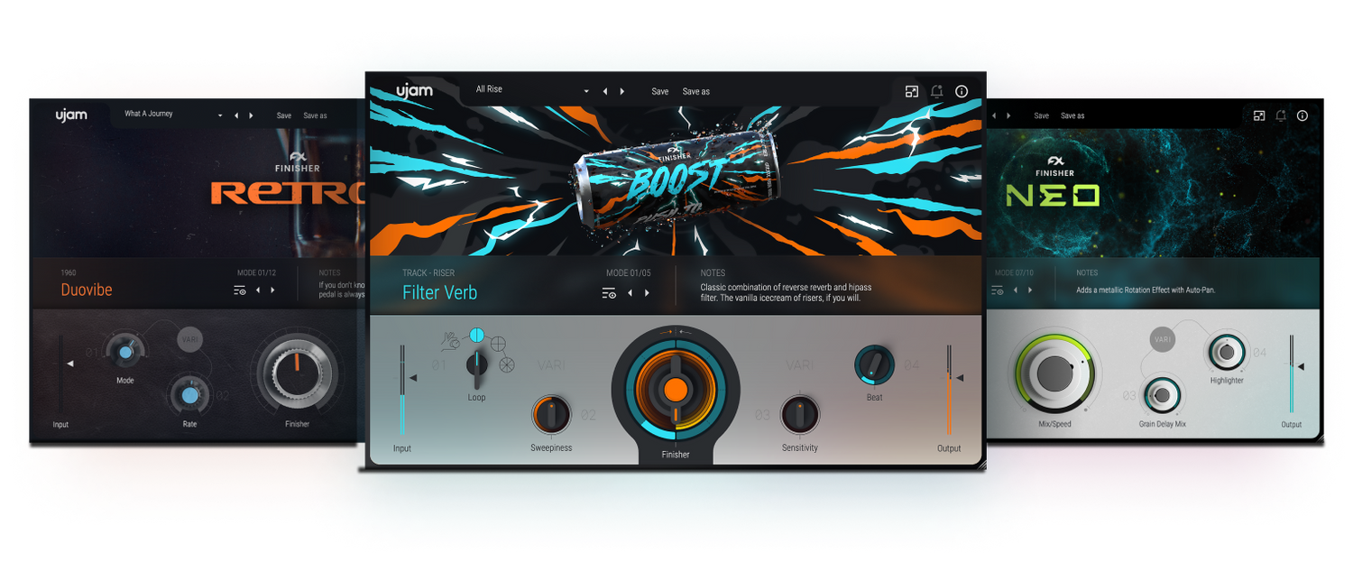 Finisher NEO leverer dynamiske moderne effekter, Finisher BOOST skaber fantastiske risers og drops, og Finisher RETRO bringer vintage-stil karakter til dine numre.