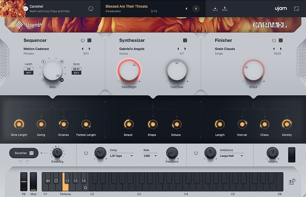 Usynth Caramel kommer med alle de rige, frodige padlyde, du nogensinde kunne ønske dig. At skabe drømmende ambient lydlandskaber er let, med det tunge løft udført bag kulisserne (wavetable valg, unison, effekter og meget mere), hvilket betyder mindre tid brugt på lyddesign og mere tid brugt på at færdiggøre sange!