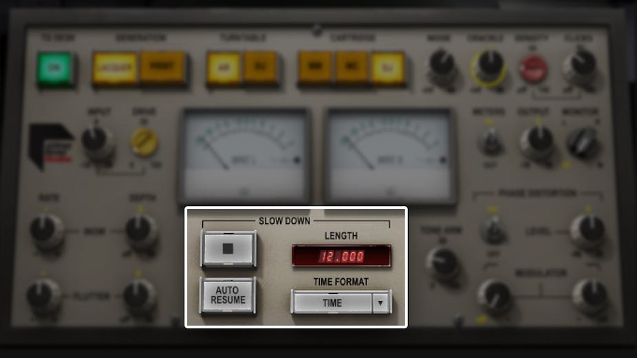 Når autenticitet er altafgørende, kan du tilføje lidt eller meget af vinylens ufuldkommenheder: pladespiller rumlen, knitrelyde, klik, wow, flutter, og endda faseforvrængning, der opstår, når stiften bevæger sig mere skråt i de indre riller.