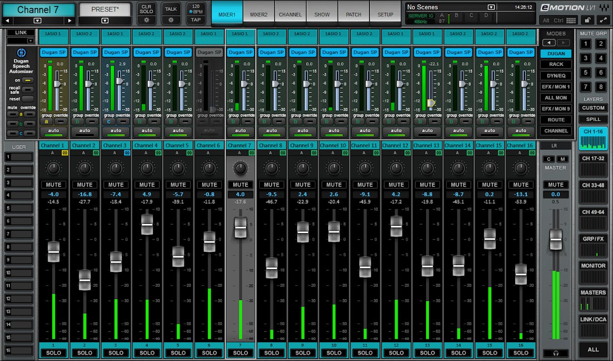 Her træder Dugan Speech automixeren ind. Udviklet sammen med lydopfinderen Dan Dugan, kontrollerer Dugan Speech automatisk forstærkningen i realtid. Glem mareridtene ved at kontrollere flere mikrofoner—nu kan du køre op til 64 mikrofoner med fuld tillid.