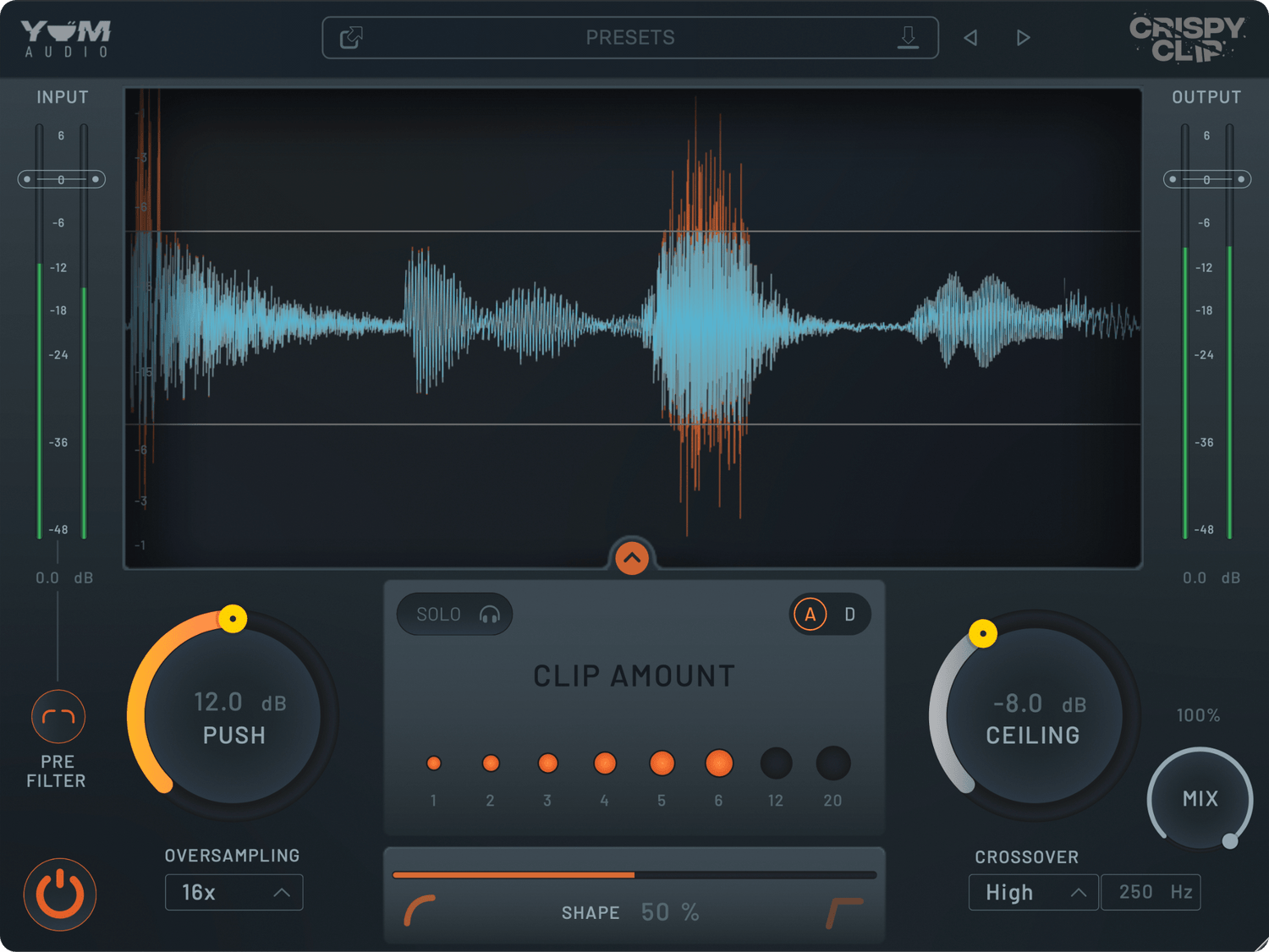 Velkommen til den næste æra af lydformning og clipping med Crispy Clip, designet til at levere en raffineret lyd ved sømløst at blande forskellige clipping-karakteristika. Opdag de tonale nuancer mellem blød og hård clipping ved hjælp af Shape parameteren, og kombiner behandlede og ubehandlede signaler ubesværet med Mix Control for en tilpasset lydoplevelse.