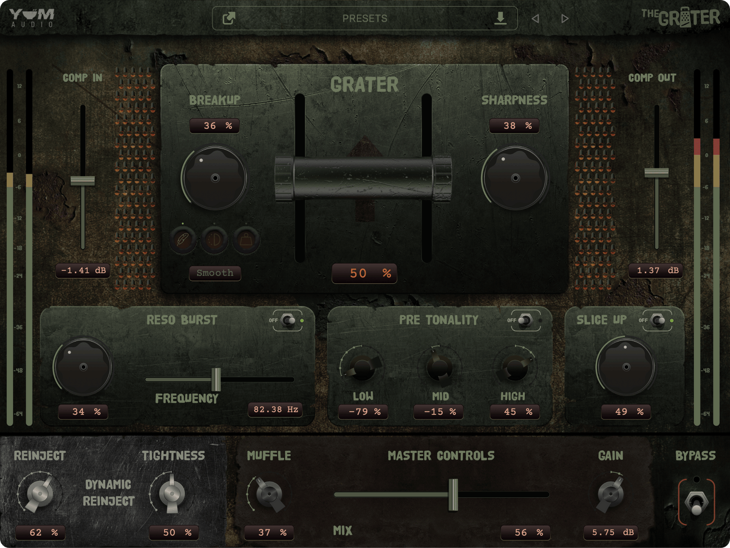 The Grater er et kraftfuldt audio plug-in, der giver dig mulighed for at komprimere og forme din lyd som aldrig før. Med sit unikke sæt af kontroller kan The Grater tage din lyd til det næste niveau ved at tilføje punch og kraft eller ved kreativt at ødelægge og forvride din lyd. Uanset om du er en mixing engineer, der ønsker at tilføje punch til dine trommer, eller en sound designer, der leder efter nye måder at forvride din lyd på, har The Grater dig dækket.
